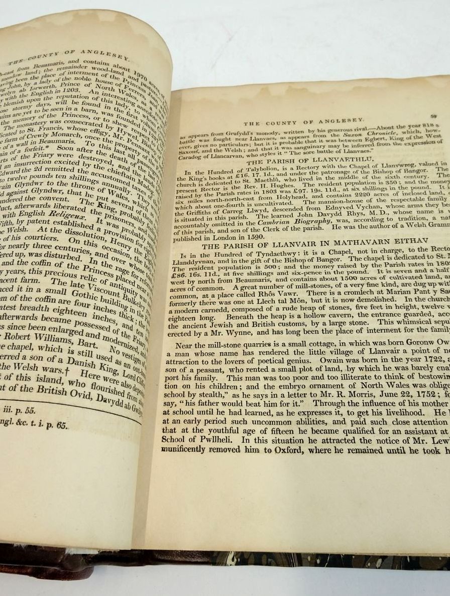 Good condition. Comprising a topographical description of the several counties of Anglesey, Caernarvon, Denbigh, Flint, Merioneth, and Montgomery. To which is prefixed a review of the History of Britain from the Roman period to the Saxon Heptarchy. Interspersed with notes biographical and explanatory. Large format. Two volumes, leather spine & corners, three raised bands to spine, gilt title to label to spine. Marbled paper boards. B/w plates.