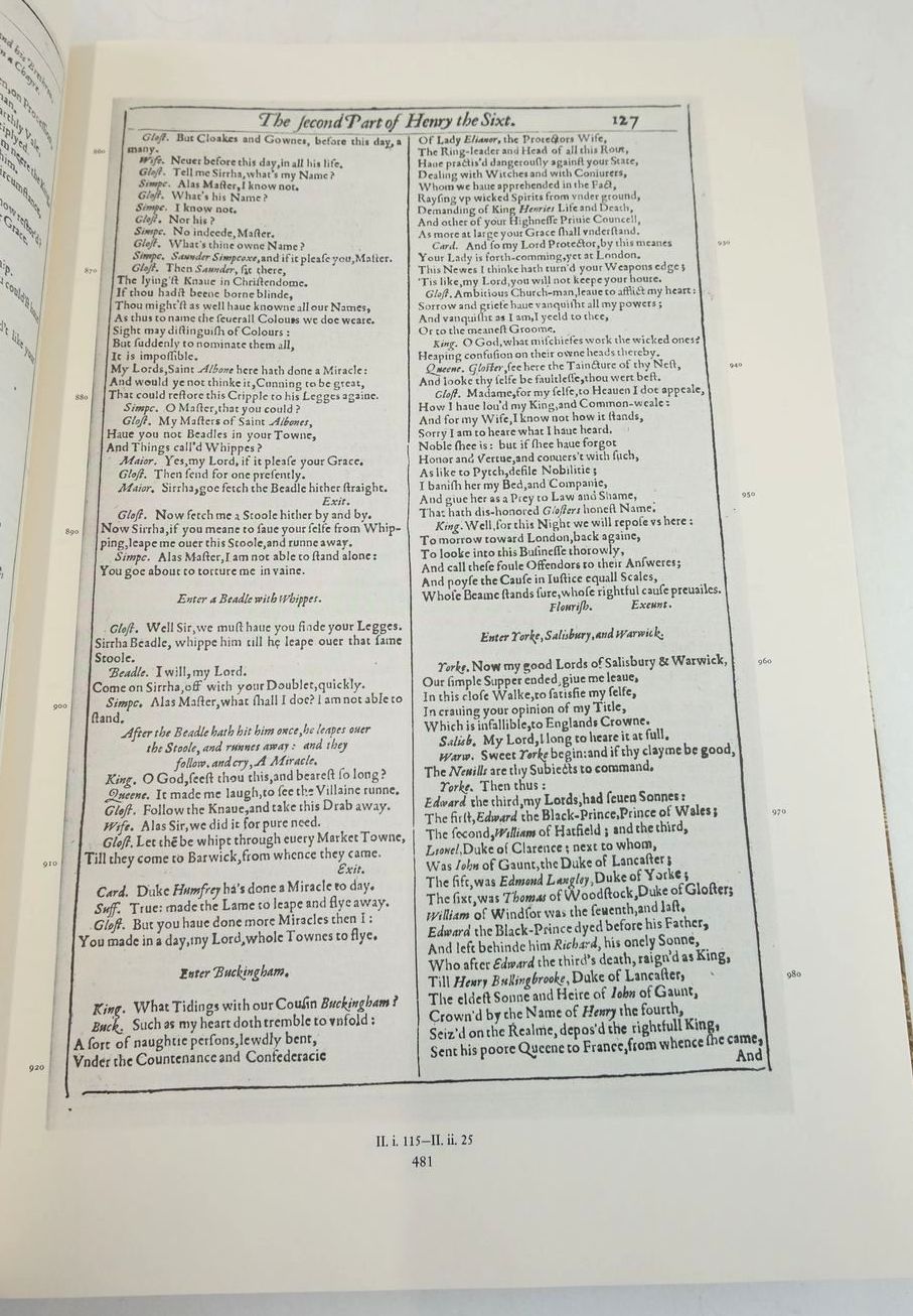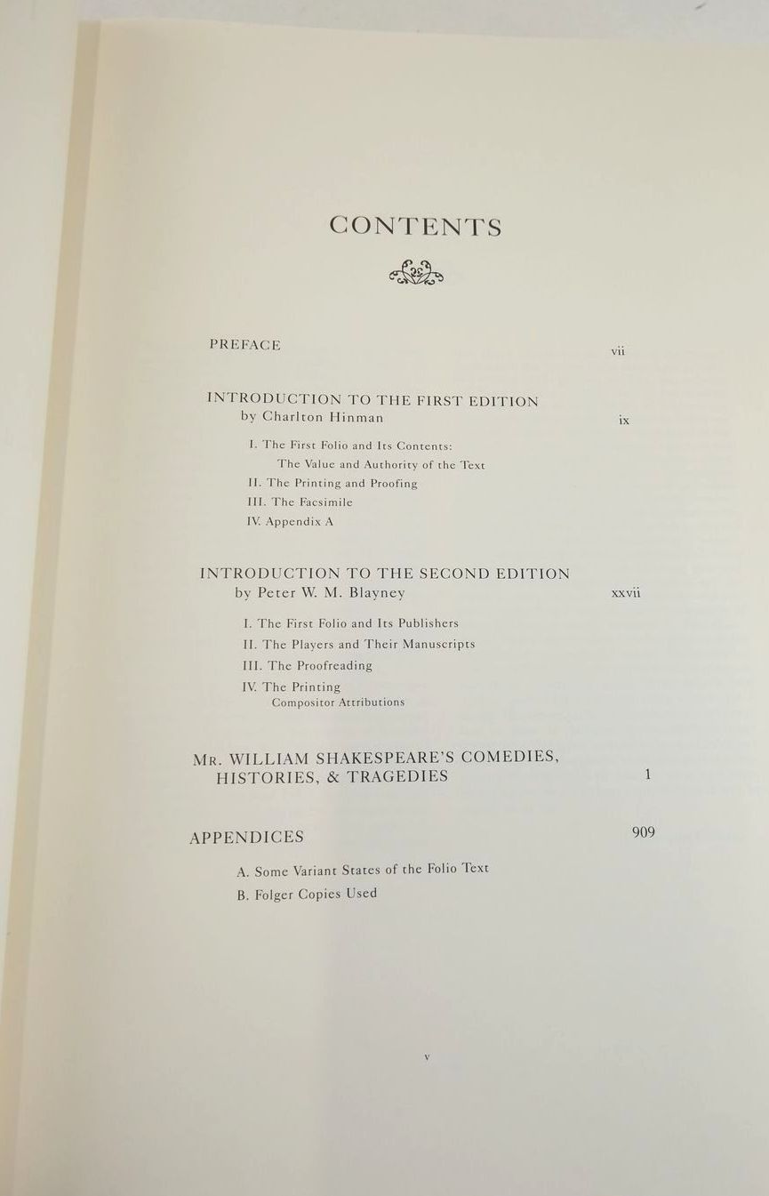 Very good condition. The Norton Facsimile. Based on Folios in the Folger Shakespeare Library Collection. Prepared by Charlton Hinman with an introduction by Peter W.M. Blayney. Large format. Heavy volume. Shakespeare's Comedies, Histories & Tragedies. Published according to the True Original Copies. Leather spine. Pictorial cloth. Second edition.