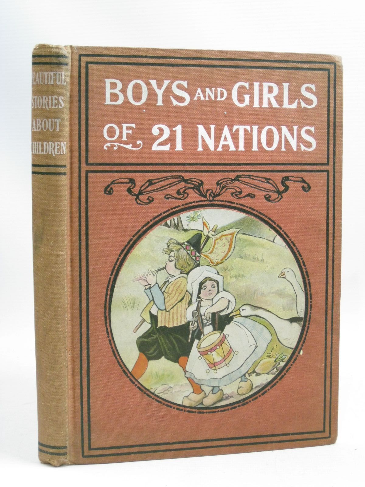Title on front cover of book is "Boys and Girls of 21 Nations". "Containing full descriptions of the children and youth of France, Norway, Italy, Sicily, India, Africa, Arabia, China, Egypt, Mexico, Canada, Kaffir Tribes, Hawaii, Cuba, Greenland and other countries. Little Folks of Many Lands with captivating accounts of their manners, dress, amusements, social customs, education, employments, etc etc, including charming stories of the little Indian boys and girls in our Western States and Territories etc. Red cloth with white titles, circular onlay to front cover. Profusely embellished with superb phototype engravings. 250 pages. Spine and corners bumped, some fading to cover edges. Inscription in ink to front endpaper. Some light fingermarks to page margins and a few foxspots to contents which are otherwise clean.