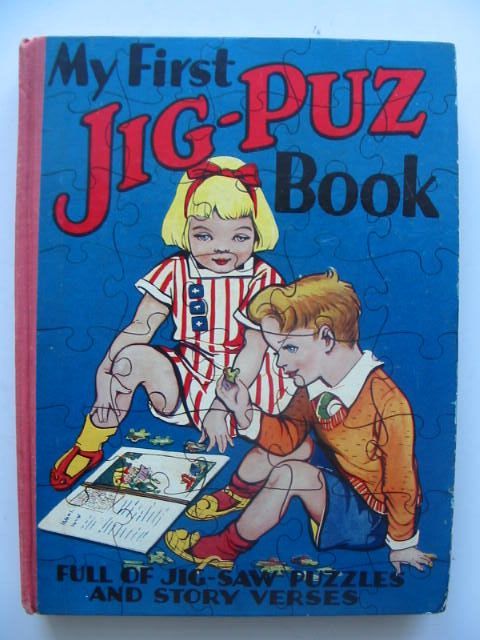 5 jigsaw puzzles and story verses. Large format. Red cloth spine, blue pictorial boards. First story/jigsaw is "The Fox Trot". Bumping and wear to spine and corners. Number '35' in pencil to top of spine. Some light scuffing to covers. Name and date in ink to top of first page. A few page marks. All jigsaws are complete.