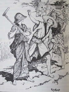 One day the mother became ill and knew she was dying. She told her daughter that she would soon have to look after herself and that this would be more difficult because she was so beautiful. The mother told the daughter to fetch a wooden helmet to wear which would hide her beauty. The mother died and after weeping for many days the girl felt she had to get back to work. She left her home and went to work for a man who owned fields. There she laboured on the land and no matter how hot the weather she kept her wooden helmet on and was therefore called Hatschihime. Despite her helmet, word of her beauty soon spread and the young men would come and try to snatch her helmet but she resisted them. Eventually her employer suggested she worked indoors caring for his sick wife. Hatschihime thought her troubles were over.