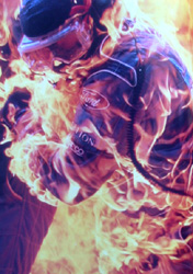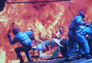 Above: the Benneton of Jos Verstappen is engulfed in flames during refuelling. He, and his pit crew, were lucky to escape serious injuries.
