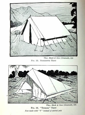 Chapter four is all about tents – selection, class of camping, weight permissible, accommodation required, type of country and climate and, last but not least, class of camper. Many different types of tents are described and illustrated with hints on how to pitch and maintain them. Regarding the 'class of camper' the author notes: 'This is almost the most important consideration of all. Hardy youth, particularly if the exchequer is limited, will submit, gladly, to conditions which women, and campers of more advanced age, would regard as discomfort and privation, and would prefer to avoid by having better equipment, even if more weighty and bulky'.