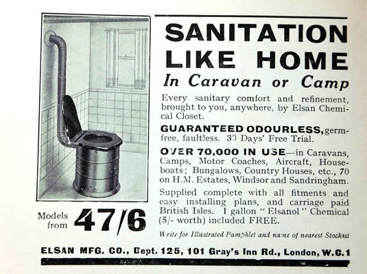 I was pleasantly surprised at how readable this book is. It consists of 8 chapters, each dealing with a different aspect of camping, followed by helpful appendices and tables. It is packed with fascinating black and white photographs and diagrams, plus interesting adverts, such as the one advertising the County Caravan – 'the only caravan you can tow from either end'! And the one for the Elsan Chemical Closet which you could have on a 30 day free trial. I wonder what they did with the ones returned after the 30 day trial??