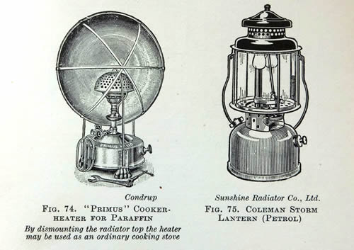 A lengthy chapter details the equipment required with comparisons of various types of stoves – wicked, wickless, paraffin and petrol and how to use them. The section on men's clothing advises one to 'take an old knicker suit' the trousers of which 'should not be of the “ultra plus four variety” as the surplus material below the knees gets soaked and is difficult to dry'. In addition, 'a pair of shorts are most useful when one does not aspire to a kilt'!