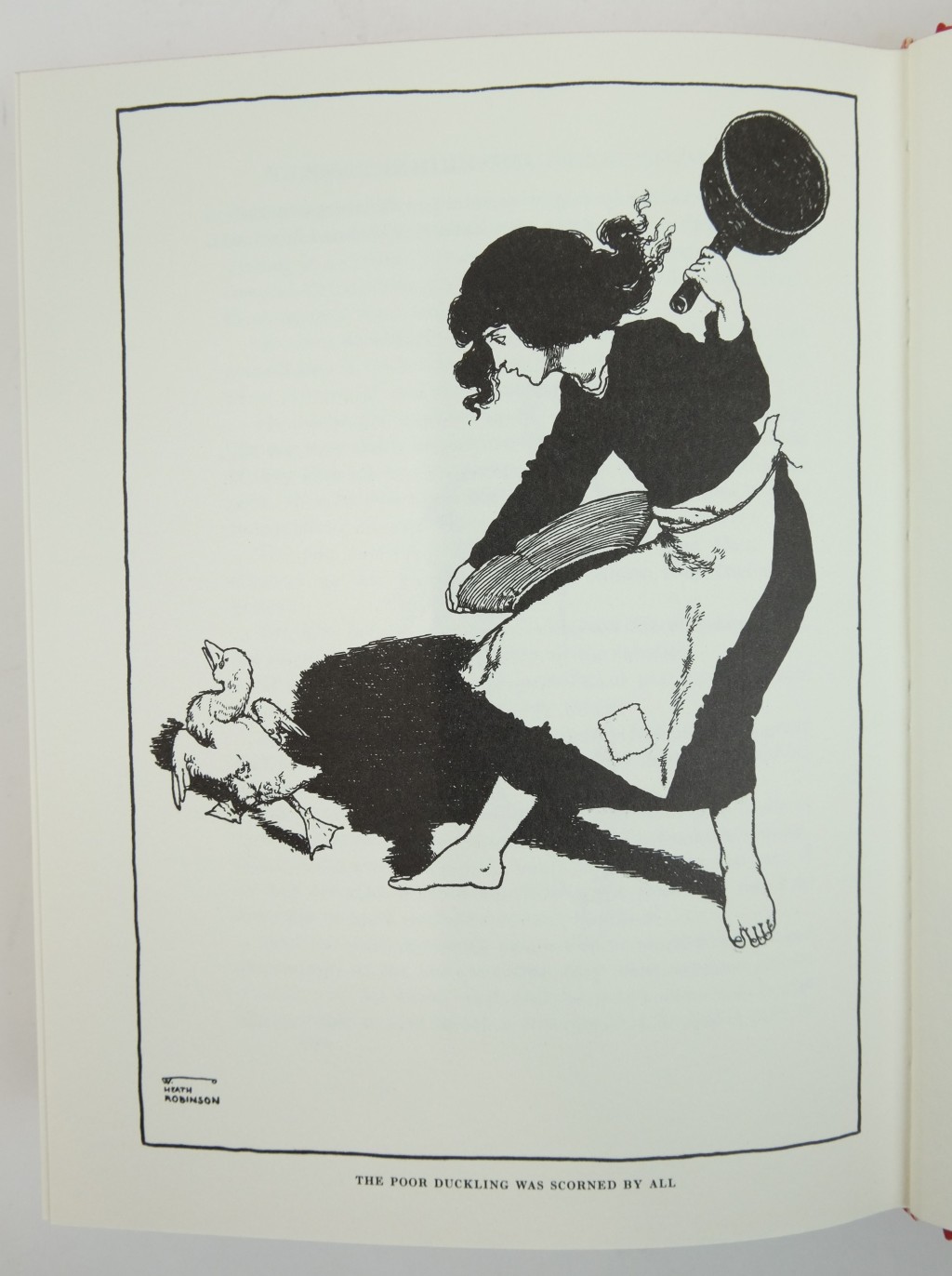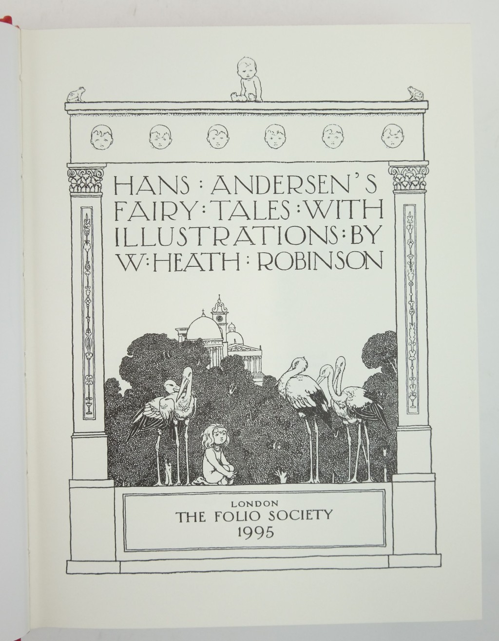 The Folio Society binding of Hans Andersen’s Fairy Tales has full red cloth with a design in white and gold by Heath Robinson on the front cover. It was published with a red slip case. This book has 16 sumptuous colour plates plus 94 pen-and-ink drawings, 17 of which are full-page (one for each story). The title page has a design with lettering by the artist.