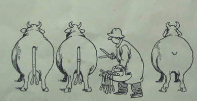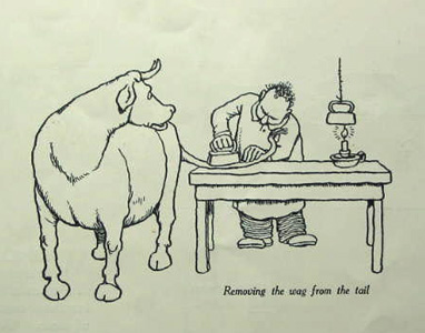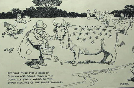 In such a collection, which includes so many gems, it is hard to pick out favourite illustrations – but I love the depiction of 'Cushion and Squab Cows in the Connolly stock yards by the upper reaches of the River Wandle'. These fine creatures are, of course, fed a diet of.... button mushrooms! Other favourites include 'Shearing Day at one of Connolly's braces bull ranches' and 'Removing the wag from the tail':- “this seems advisable, for waggishness is a thing to be suppressed, as most people who have suffered from it will readily agree”.