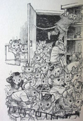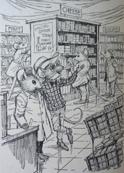 The family is very impressed with Howard, all except Mrs Peck who has "a nasty feeling about it in the back of her mind." Anxious to impress Cousin Howard , Thursday takes him down to the store to show off the wonderful place. Cousin Howard however can't believe his eyes! He thinks it is something out of the Middle Ages and tells Thursday about the Self Service stores they have 'back home'. There, a cheese baron - Al the Smell - owns half the mouse cheese supermarkets in New York and spends his time lying beside the pool! Furthermore all the cheese is wrapped, not cut to order! Howard persuades the family to alter the store to become a self service shop with all the goods pre-cut and wrapped.