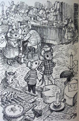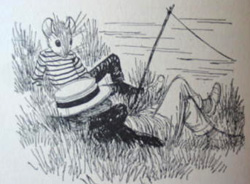 The other mice encourage Thursday to stay and take part in the adventures of his fellow Cupboardosities and Thursday soon settles into life with the Peck family. He helps out with Mr Peck's Exchange and Mart Store - delivering orders, polishing the counter, spreading sawdust on the floor. Whilst delivering groceries he meets with a short sighted vole called Harris who lives by the river in an untidy, cluttered house. Thursday enjoys his encounters with Harris and the two soon become firm friends. They spend time fishing (not that they catch anything very often), talking or simply lying in the grass watching the world go by. On one such occasion Harris remarks that "The quieter you are the more you hear." He adds that one day he counted 156 sounds! Thursday is very impressed as Harris lists the different insects, animals, birds and other noises that can be heard.