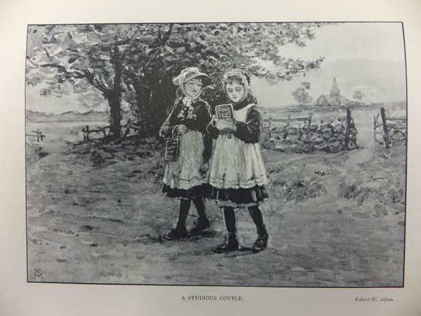 Tuer further explores more illustrations, many of which are printed alongside the text. ‘A Studious Couple’ by Robert W. Allan depicts two young girls (above right), obviously on the journey to or from school; the one has the horn-book hanging by the cord on her wrist, while the other holds it close to her chest. You can imagine this scene on the ‘school run’ in times past.