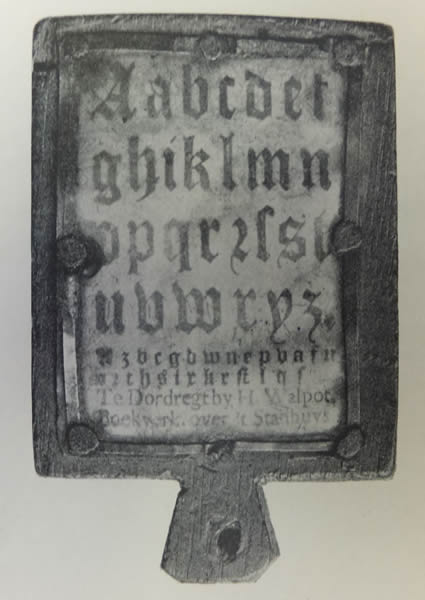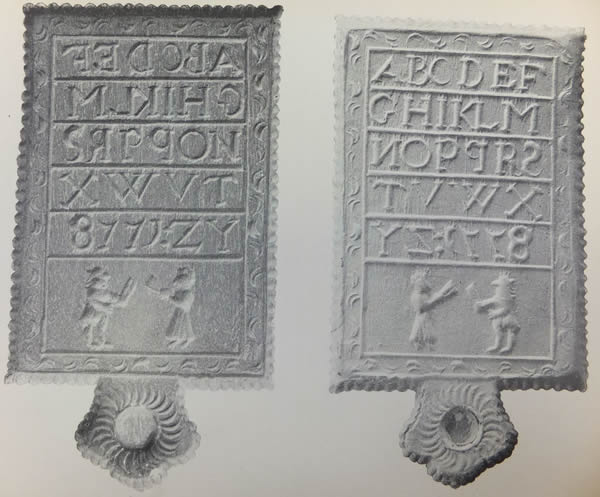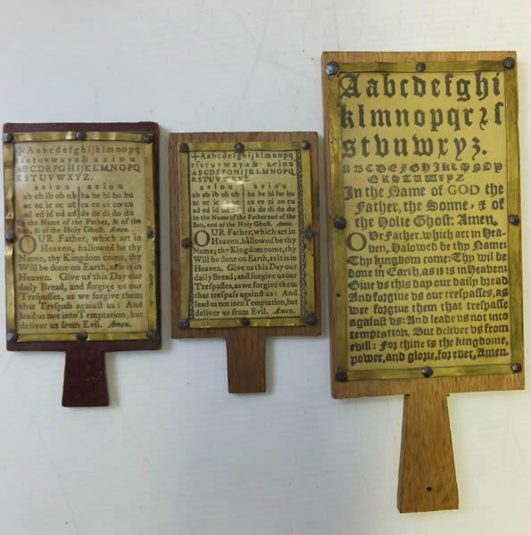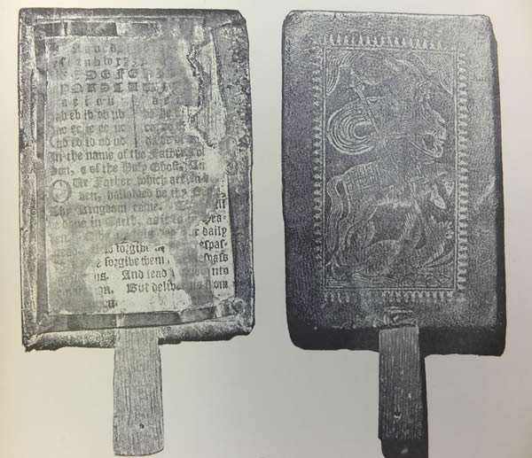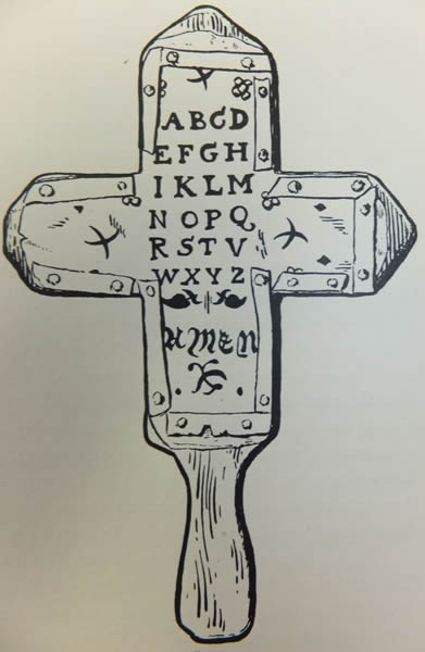 Above left: Flemish-made horn-book largely supplied to English market. Above right: horn-book in shape of a cross