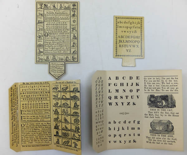 Volume II contains the following facsimiles (below right): 1. A cardboard horn-book. 2. The British battledore or horn-book. 3. The royal battledore. 4. A later battledore.