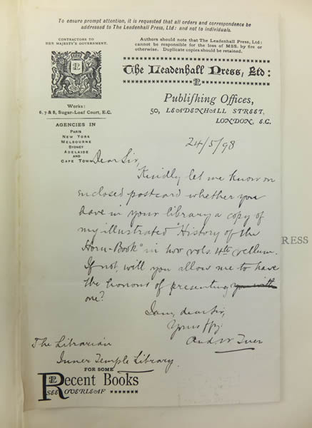 It appears that some examples of this original edition were presented to different institution libraries by Andrew Tuer himself. The copy in stock at Stella Books (September 2016) has a hand-written note dated 24/5/98 which has been pasted to the edge of the dedication page, presenting the copies to the Librarian at Inner Temple Library (below right).