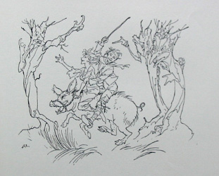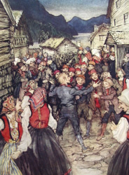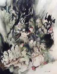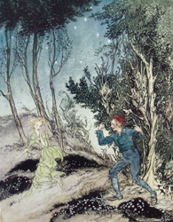 With its blend of satire, fantasy and Norwegian folktales Peer Gynt is a perfect canvas for the illustrations of Arthur Rackham. Especially effective are the scenes where the young Peer is mocked for his rags and boastful stories, and where Peer follows the Troll King's daughter, the mysterious Woman in Green - see how many troll faces you can see hidden in the trees of the background!