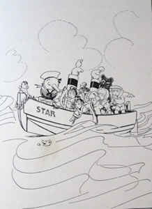 The next trip is by boat to America with Patrick as the Captain. At times the sea is very rough and they all feel sea sick. They much prefer it when the sea is calm and they can enjoy the journey. Poor Little Teddy falls overboard and has to be rescued by Quacky. In America they stay in a hotel where they have great fun going up and down in the lifts and eating hot dogs – a name that causes much amusement! The highlight of the visit is to see the great waterfall at Niagara.
