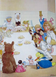 At the beginning of this book Josephine is watching her children (as she calls her dolls) who are all scattered about the nursery. Quacky is painting a pig that ends up with three ears and Dorothy is knitting. Things threaten to get a little out of hand when Dorothy makes fun of Quacky's painting and Teddy, wanting to show he is on Quacky's side, puts a green paint mark on Dorothy's face. Josephine tells them to tidy up as it is time for tea and she has a secret to tell them. All the dolls love secrets!
