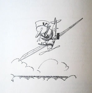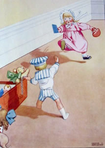 After tea (bread and butter, then bread and honey and then a piece of cake) Josephine tells them her secret. They are to go travelling by train, by ship and then on an aeroplane! The dolls begin to talk at once and want to know how the aeroplane will go. Josephine, who is a little unsure, tells them that a man called a Pilot will make it go. Quacky who can drive a car volunteers to be the pilot. Josephine arranges for him to have lessons so he goes off with his notebook every morning for a week and comes back looking more important as he is getting cleverer and cleverer.