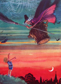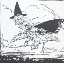Mother Goose herself is usually portrayed as an old woman, and often with witch-like characteristics. The 16th and 17th centuries saw an obsession with witches and this period of history is renowned as the time of the great witch hunts. As many of the rhymes originated during this period, the children of the time would have been familiar with stories of witches and witchcraft. This could be why Mother Goose in the original rhyme was able to fly through the air, had a house in the wood and an owl at the door, and could also provide an explanation for her depiction as an old crone in many illustrations.