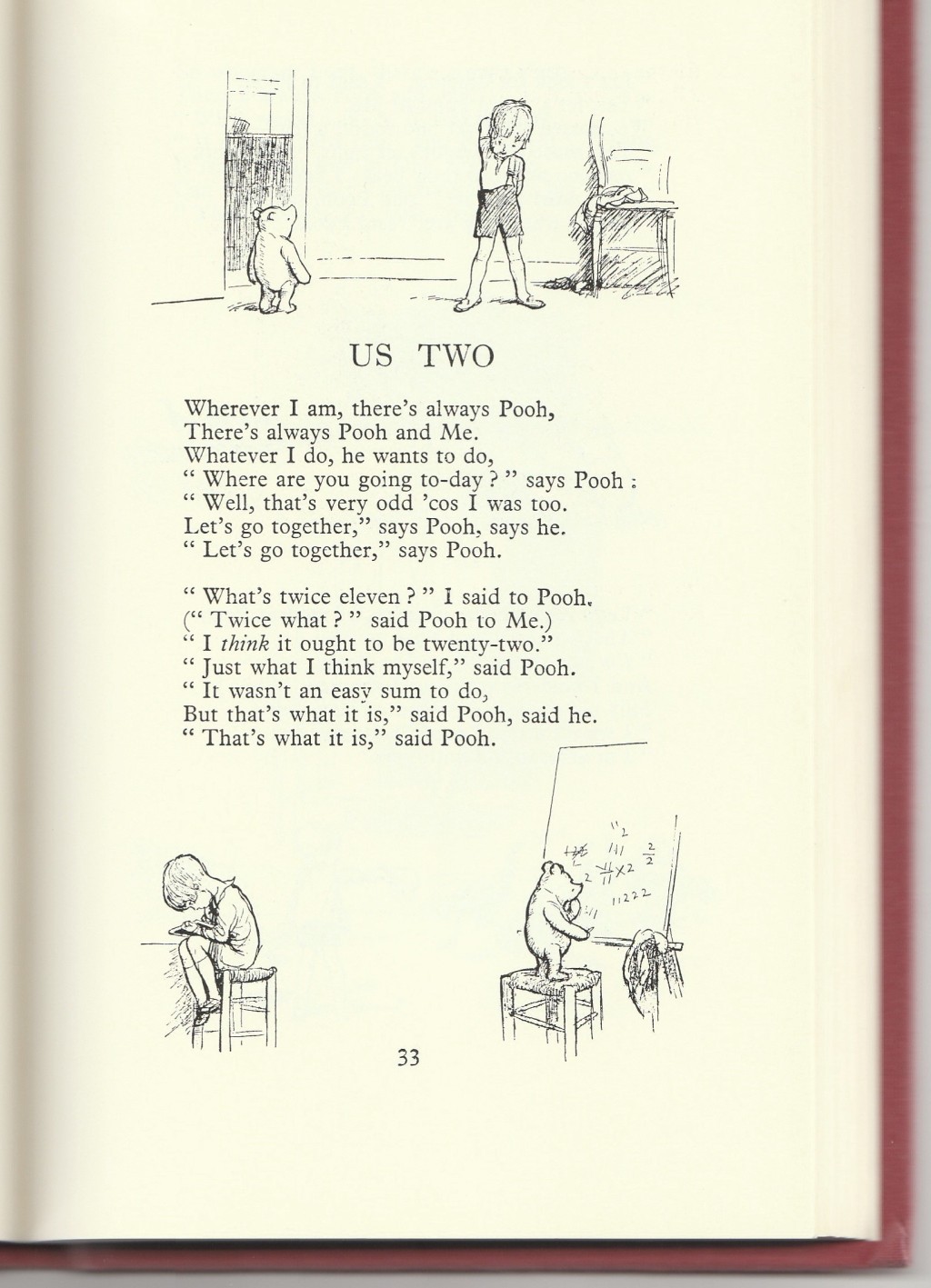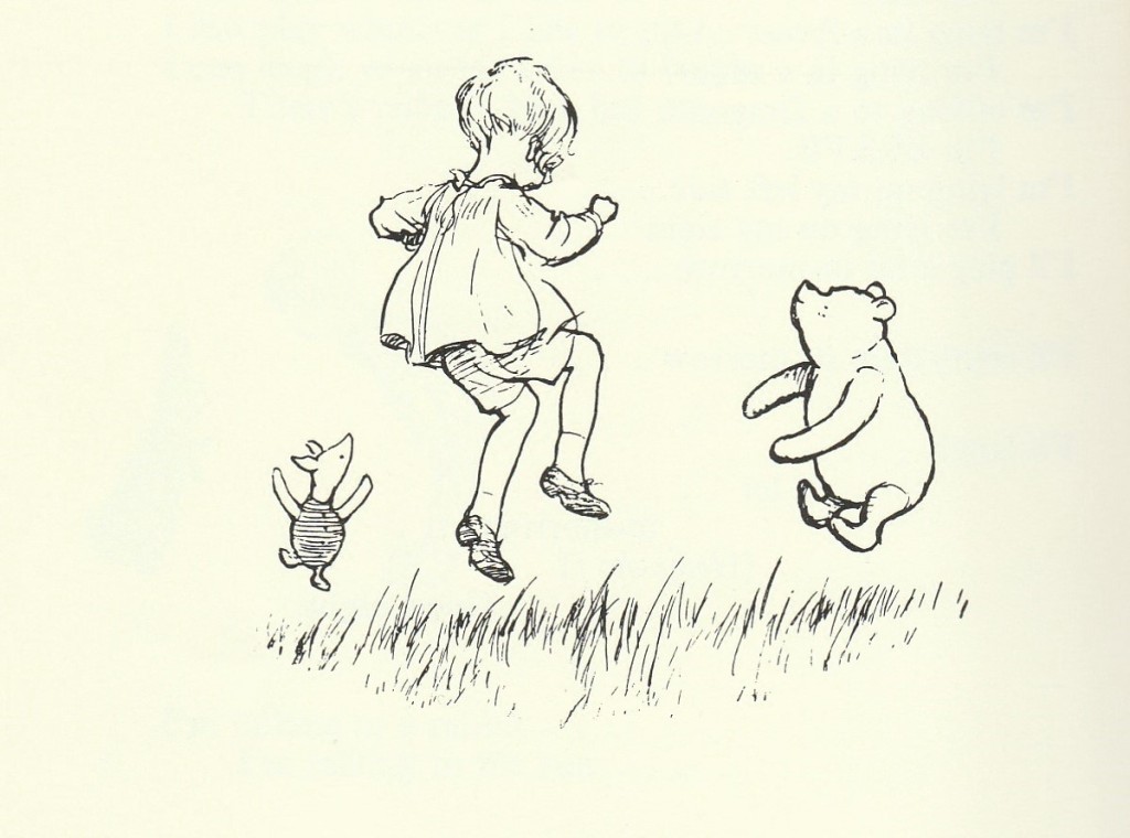 Many of the verses feature Christopher Robin, but only two (that I could see) feature the much-loved Winnie-the-Pooh, specifically, 'Us Two' and 'The Friend'. He does, however, keep popping up in the E.H. Shepard illustrations that accompany eleven of the poems. This is explained by Milne in the postscript of the introduction where he writes: