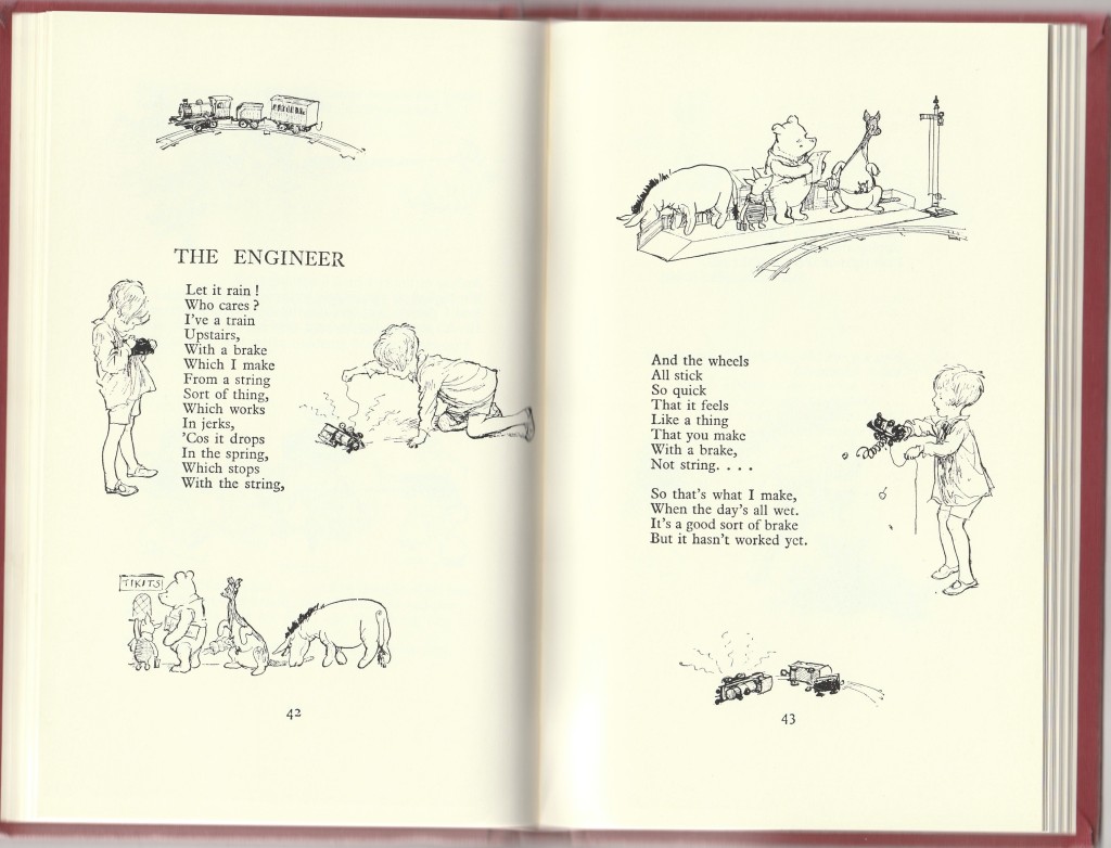 'The Engineer' also features illustrations of Pooh, along with Piglet, Kanga, Roo and Eeyore (no Tigger – as he didn't appear until ‘The House At Pooh Corner’). In this verse, Christopher Robin along with his 100 Acre Wood friends appear to be upstairs in the nursery, as it's raining outside, but that won't stop their fun: