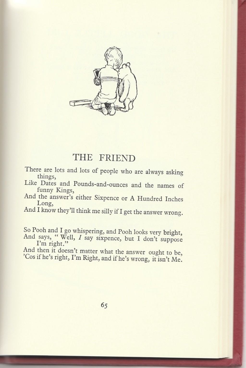 Were some verses rejected for ‘When We Were Very Young’ and later included in ‘Now We Are Six’? I don't know. Perhaps there were just too many to choose from. Of course, Christopher Robin Milne, for whom they were written would have changed a great deal, as children do, in the three years over which they were composed.