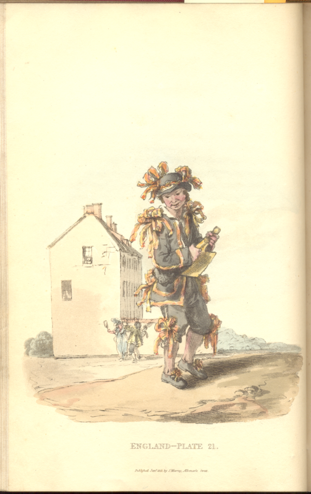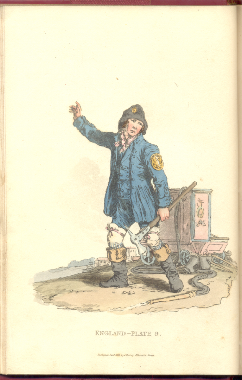According to research, the plates are engraved from earlier images by William Henry Pyne (although they are not accredited in our copy), presumably from those published in his ‘The Costume of Great Britain’ (London: 1804, 60 plates). The plates are coloured by English engraver William Alexander. The plates are executed with a refreshing liveliness and freedom that is not usually seen in books of this type, but which is typical of William Alexander’s etched and engraved work.