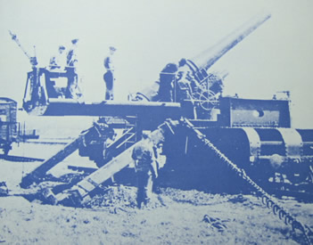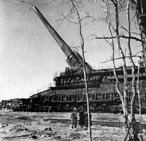 The most impressive German railway gun, in terms of its sheer size, was the 80cm calibre 'Gustav (left)'. Weighing 1350 tons it could deliver a shell weighing 7 tons to a target 38 kilometres away! To spread the load of its massive bulk, the weapon was mounted on specially prepared twin railway tracks and had to be dismantled before it could be moved between locations. It was used with some success against the fortifications of Sebastapol, but the huge amount of time and effort required to move the weapon and construct the railway tracks was a major weakness.