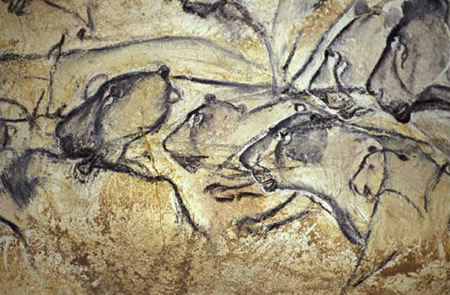 The earliest recorded depictions of lions can be found in paleolithic human cave art possibly dating to 32,000 years ago in the Chauvet Cave in the Ardèche region of southern France, where lionesses are depicted hunting for the pride in much the same strategy as contemporary lions. Found first in Ancient Egypt, the sphinx, which had the head and shoulders of a human and the body of a lioness, represented the goddess who was the protector of the pharaohs. Later pharaohs were depicted as sphinxes, being thought as the offspring of the deity. Bastet (cat goddess of protection and the "eye of Ra") originally was depicted as a lioness. Lions were widely represented in other middle-eastern cultures. In ancient Mesopotamia the lion was regarded as a symbol of kingship and The Dying Lioness is a relief panel from 650 BCE, Nineveh (modern day Iraq) depicting a half-paralyzed lioness pierced with arrows, while the Babylonian goddess Ishtar has been represented driving a chariot drawn by seven lions. Lions have also over the centuries been depicted in numerous forms in the Far East and have enjoyed widespread use in heraldry.