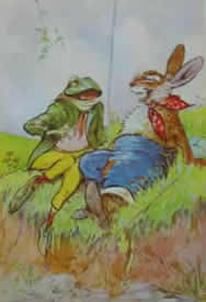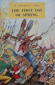 It is in The First Day of Spring that we see Tasseltip leading his friends astray. He is on his way to school, but thinks the weather is too nice to be inside! He meets up with Robert Rat and they encounter Mr. Hedgehog who wonders why they are not in school. He does admit that he is glad he's not in school anymore. Tasseltip takes this as a sign that they shouldn't be going to school, so they hide their books and go off to play gathering up other friends on the way. Some take more persuasion than others! The friends decide to play rounders with Frankie Frog's mossy ball until the ball is hit into the water. They then make a swing using Susie's satchel for a seat. The fun ends when Mr. Hare the schoolmaster appears. Naturally he is not pleased but Tasseltip does own up and takes the blame. Mr. Hare agrees that it is too nice to be inside and that they will do lessons outside - but Tasseltip must agree to not do it again.