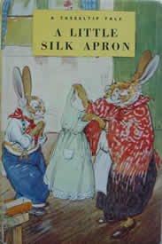 It is in this book that we see how kind hearted Tasseltip is when he wants to buy his mother a new apron. He hasn't enough money for the braces and an apron. Mrs. Squirrel takes pity on him and offers him a pair of Friskie's braces, so that using the money for braces plus his own spending money Tasseltip can buy a lovely green silk laced apron for his mother.