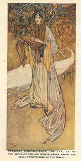 Finally, the vizier's daughter, Scheherazade, who is both beautiful and wise, volunteers to be the sultan's next wife, much to her father's anguish! Scheherazade entrances the sultan and postpones her execution by telling a fascinating tale. One story leads to another, and after a thousand and one nights the sultan is so enchanted by her stories of princes and slaves, thieves and sailors, genii and magicians, that he renounces his oath and declares her his permanent sultana, thereby restoring peace to his realm.