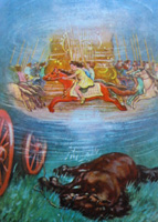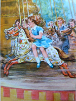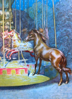The story continues with a trip with the farmer to the market, where it was 'Fair Day'. Even though still feeling above his work, Merrylegs begins to enjoy the fair day, watching all the comings and goings, hearing the happy music playing and even a Punch and Judy show! It is at the fair day that the little pony finally realizes what it is that he should become in life. He notices a roundabout and to his great surprise, it is not chairs that the children are riding on - but horses - "What horses!". 'These were lordly creatures, with proud, flashing eyes, and wide nostrils. Their long manes and tails floated out behind them, their fore-feet pawed the air, and they had coats of scarlet, with here and there a touch of gold'.