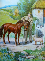 Merrylegs now longs to be back on the farm and takes his chance when someone comes to untie him. Off he gallops, back to the farm and his friends Daisy and Squeaker. Having learnt his lesson, the discontented pony, is discontented no longer - but found that he 'quite enjoyed his work' after all.