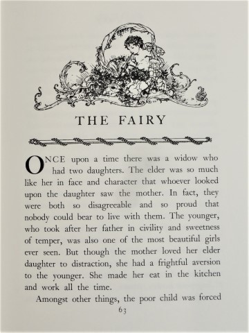 'The Fairies' is also known as 'Diamonds and Toads' (although it is listed in this book as the singular 'Fairy'). This story is about a bad tempered widow who has two daughters. The elder daughter, Fanny, is extremely disagreeable and proud but behaves just like her mother and is therefore her mother’s favourite. The younger daughter, Rose, is sweet tempered and beautiful and takes after her late father. The widow is jealous and both she and her elder daughter mistreat and abuse the younger daughter. Rose meets a fairy and draws some water for her at a well. The fairy blesses her with a spell that meant, whenever she spoke, jewels, precious metal or a pretty flower would fall from her lips. Upon seeing this, the widow insists her elder daughter, Fanny, goes to meet the fairy for the same treatment. However, Fanny is rude and disagreeable to the fairy and Fanny's reward is to have a toad or a snake fall from her lips whenever she spoke! The widow is enraged and throws Rose out of the house but, happily as in all good fairy tales, Rose meets a prince and marries him!