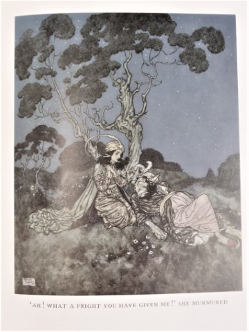 Accompanying these stories are 30 full page colour illustrations by Edmund Dulac, an early 20th century illustrator. The illustrations appear delicate in nature and are typical of Dulac’s oriental style. The combination of the beautiful binding and the atmospheric illustrations make this a book to delight and to treasure.
