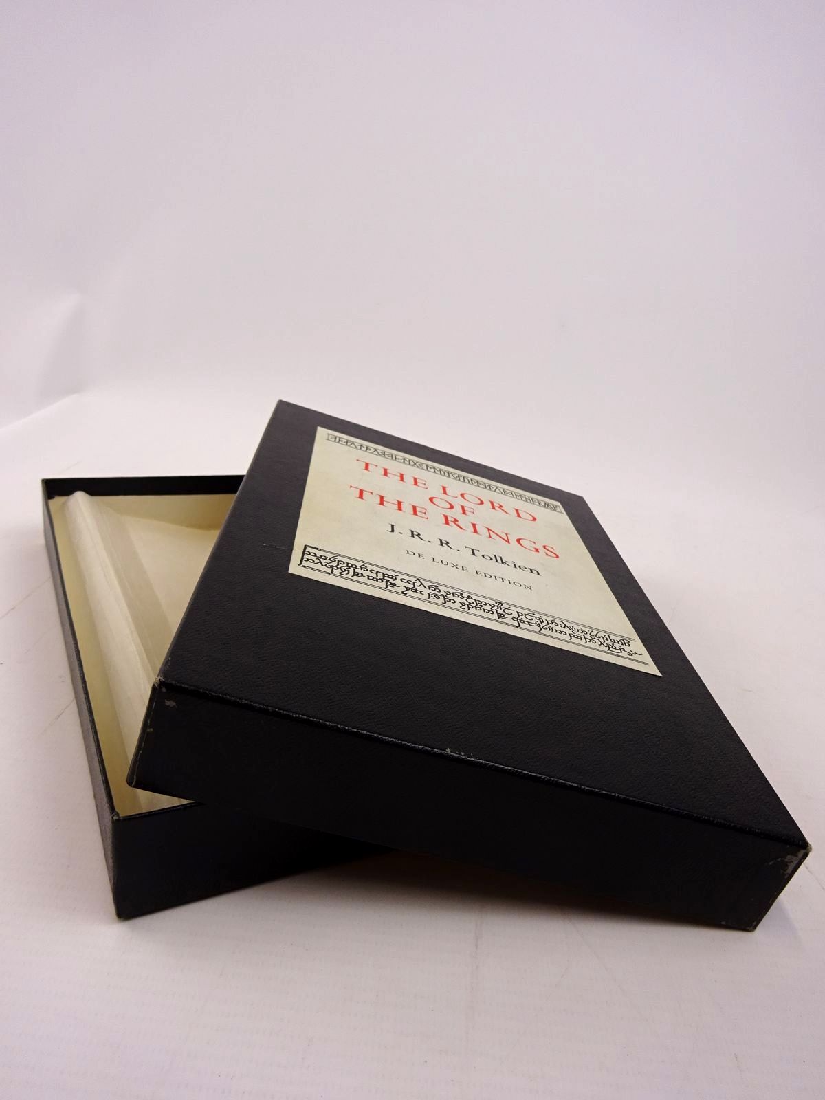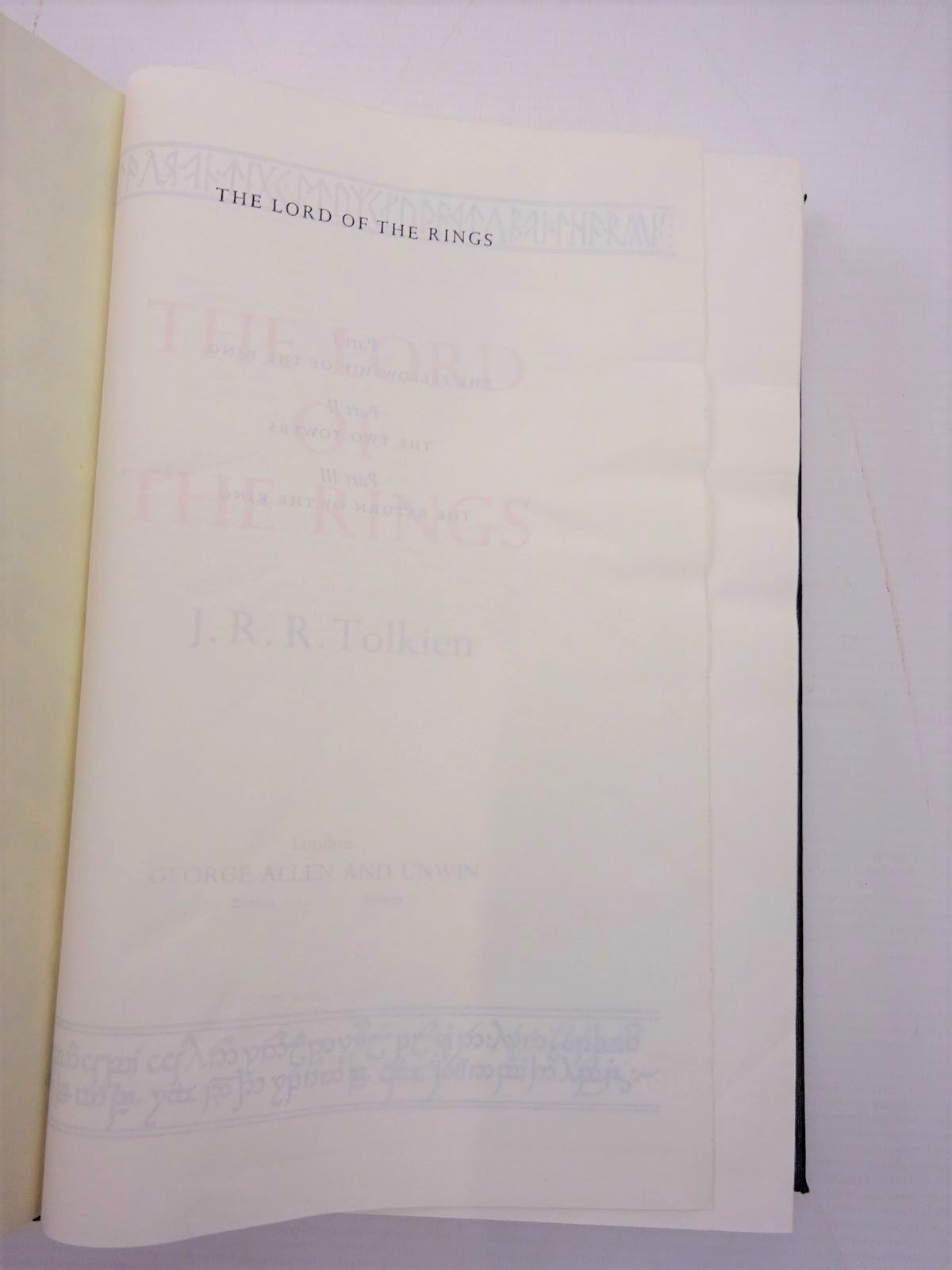 It is printed on what appears to be a type of tissue paper which is actually India paper, often used in the production of Bibles, hence the slim format. Two fold-out maps are included – one at the beginning of The Return of the King and one at the rear of the book. These are often missing from the book as they make attractive pictures to hang on the wall when framed. This desirable and collectable edition, contained in its original box, is published by George Allen & Unwin. Two other Tolkien titles are available in this deluxe series at time of writing: The Hobbit and Poems And Stories.
