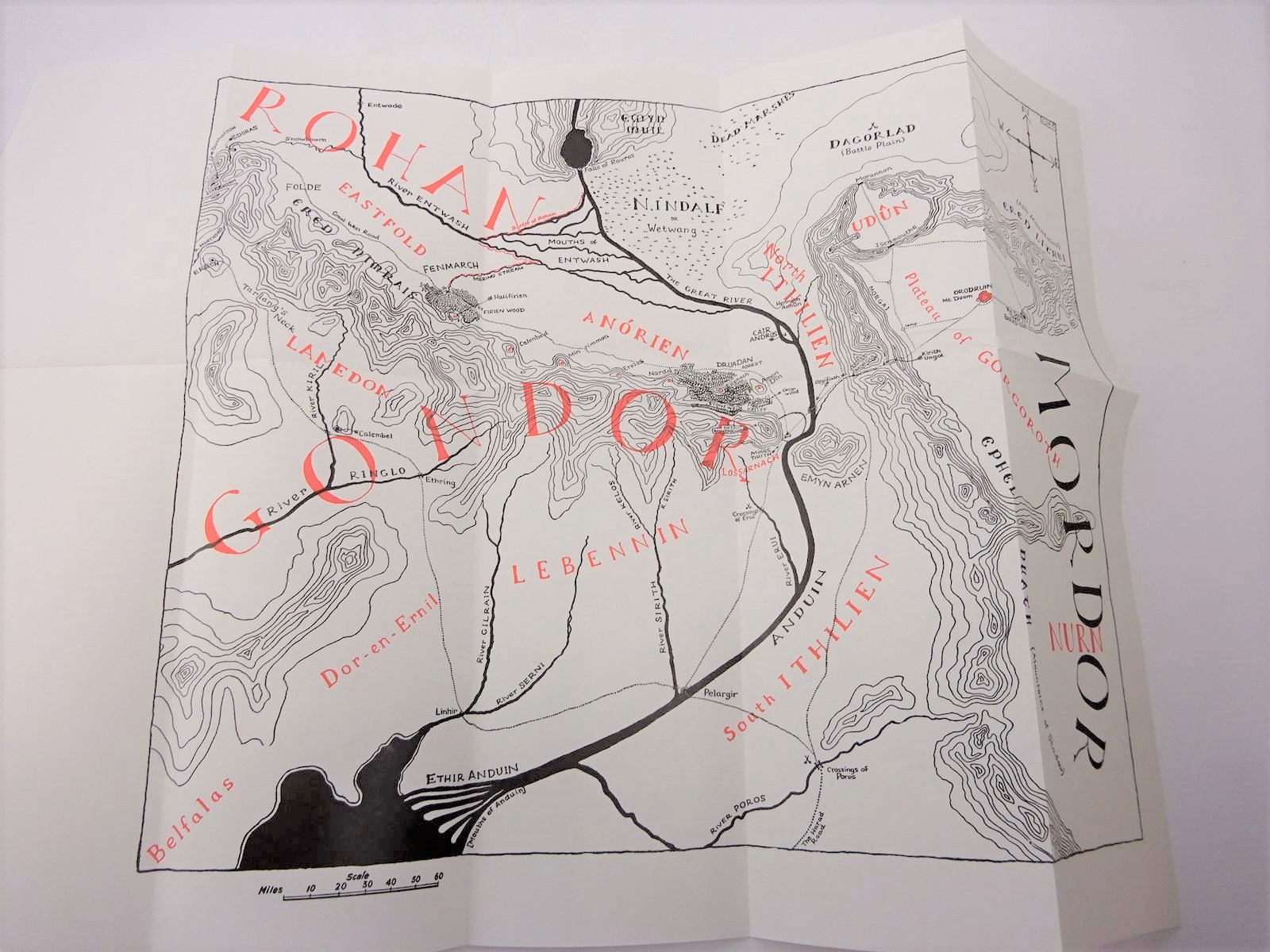 The De Luxe Edition consists of all three books bound in one volume. The book is surprisingly slim considering that it has a total of 1193 pages including the index at the rear. The binding is black buckram cloth with gilt title on the spine. The front cover has a fantastical gilt, silver and metallic green design depicting the Numenorean throne with ‘Elendil’ in Tengwar script. (Numenor was an island to the west of Middle-Earth and Tengwar an artificial script created by Tolkien).