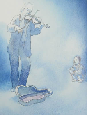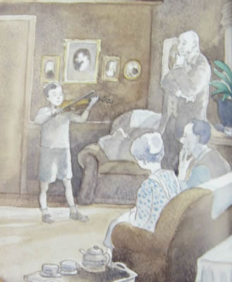 Paolo often sought out the man and stopped to listen whenever he played. He discovered the man was Benjamin Horowitz, aged 62. One day Signor Horowitz let Paolo hold his violin and showed him how to play. From that moment Paolo knew he had to become a violinist. Paolo told him about the violin belonging to his father and Signor Horowitz said he could mend it if Paolo brought it to him. So carefully carrying the precious violin Paolo made his way to Signor Horowitz's home. The violin was mended and Paolo began to learn to play it.