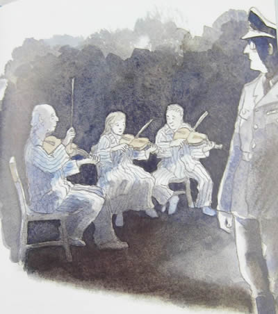Auditions for an orchestra were held and the musicians played for their lives. Rehearsals followed - although they didn't know what they were rehearsing for. They played Mozart a lot. At first they gave concerts for the officers but later they were made to play whilst train loads of new prisoners arrived. Some of these were instantly herded off to death, others were made to work, but the musicians played on – Mozart.