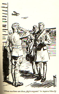 "Biggles closed the door and then faced the two junior members of his flight. 'Just what do you two fellows think you're doing here?' he asked quietly. Thirty felt the blood drain from his face. 'Doing here...' he echoed foolishly.