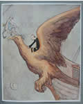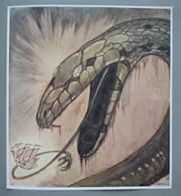 The book is divided into three parts. Part one shows the planning, building, launching and departure of the ship. Part two describes its weird and wonderful journey to mars including its encounters with monsters, meteors, Eden's Serpent, air sprites, the star of classic myths, the seven sisters and many other delights. Part three details the arrival on Mars itself and follows the company's adventures in and around the palace gardens, the iron hills, thunder city, and the Temple, ending with the finished palace of the princess. "...in an instant, with distended jaws opened to engulf them, the head of Eden's Serpent towered above..." Timlin sent the book to the publishers George Harrap who where looking for a successor to Willy Pogany. Harrap was delighted and decided to publish the entire work in its original form, - without typesetting. Both the watercolour plates and the calligraphic text were each separately mounted on grey matte paper. This splendid volume was published in November 1923 selling at two guineas. It featured grey boards and an ornately decorated vellum backstrip on which one of Timlin's own designs of the ship sailing on a cloud over an array of planets was embossed in gilt.