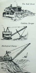The construction of canals has moved with the development of mechanical aids, from manual labour with crude tools to the large ship canals constructed with massive machines.Waterways of the World describes some of these with their quirky names (see right). Also described is the working of the lock system which enabled canals to be built over hilly country. The old gate pattern is still used in many canals but the sluice pattern is now common where rivers adjoin the canals. There are many curious features that had to be invented in order to overcome natural obstructions. In consequence an engineer named Brindley carried the canal over the river Irwell via an aqueduct rather than a series of locks. Later on this was replaced by moveable aqueduct which is a swing bridge revolving on a central pier.