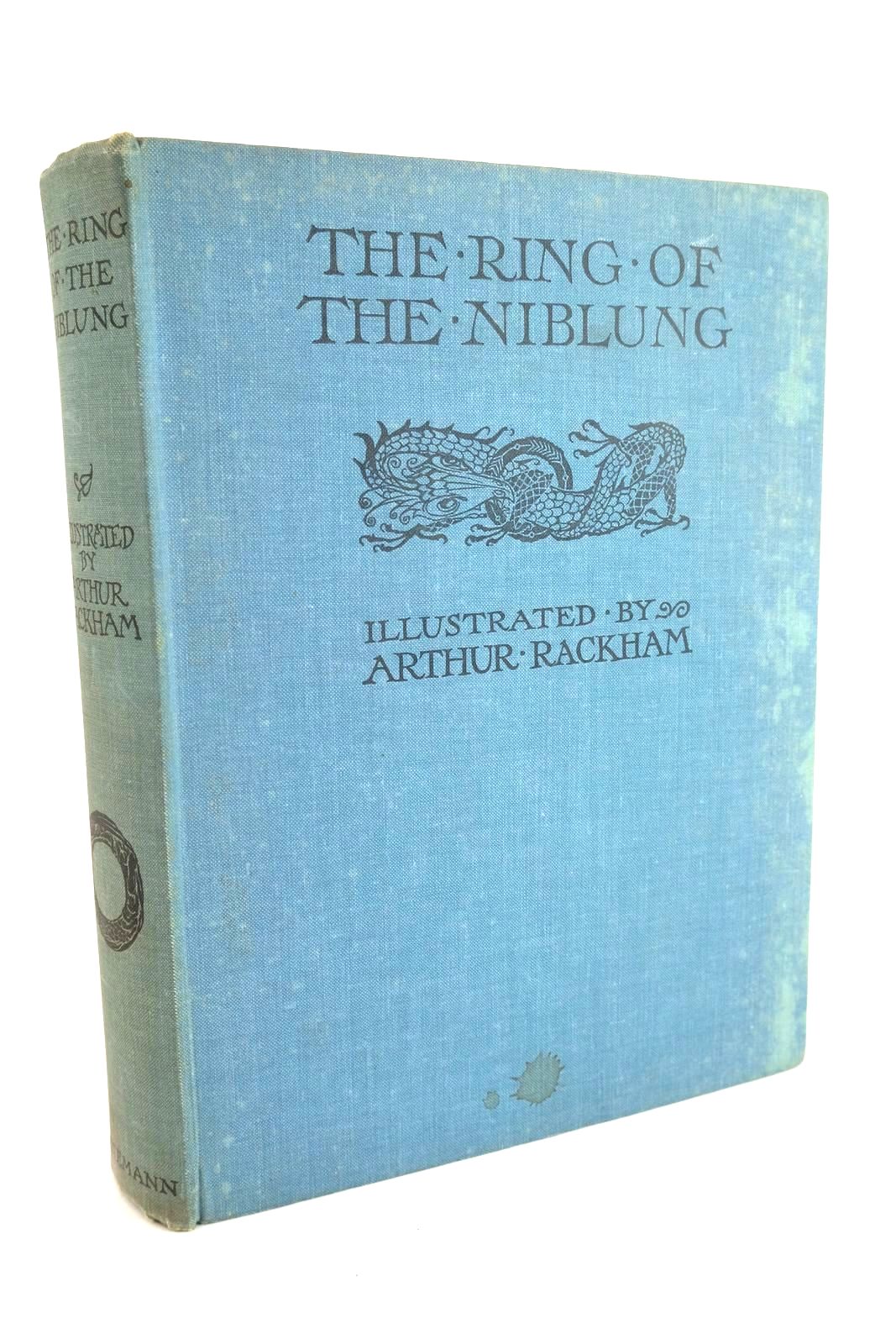 A Trilogy With A Prelude By Richard Wagner. 2 Volumes in 1: The Rhinegold and The Valkyrie; Siegfried and the Twilight of the Gods, originally published in 1910 and 1911. 48 dramatic colour plates and b/w decorations. Blue cloth, black titles. Green/white pictorial endpapers. Spine and corners bumped. Spine slightly rubbed. Damp spotting to cover edges. Small splash mark to lower edge of front cover. Foxing to contents.