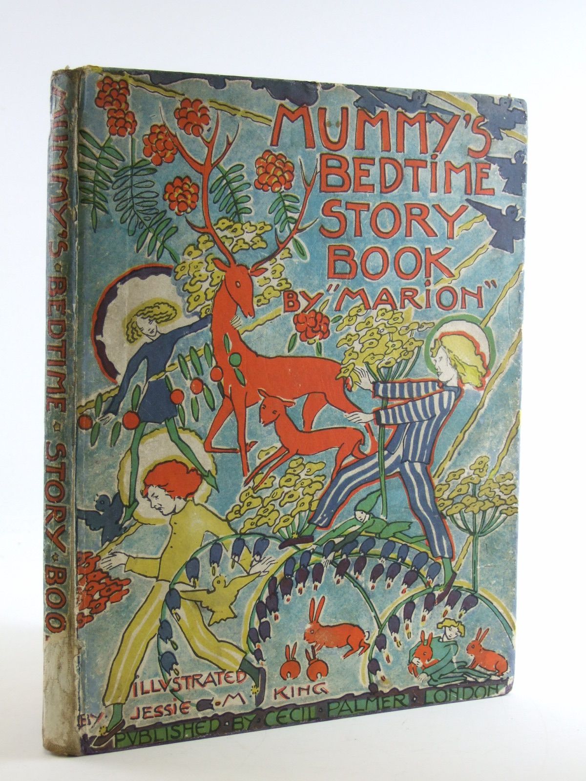 Large format. Blue pictorial printed paper boards. Yellow, blue & white pictorial endpapers. Bright two tone and full colour illustrations throughout. 56 pages. An excellent example of Jessie M. King's illustrative style. Bumping and wear to spine and corners. A few scuff marks and indentation marks to covers. Bottom 2-3" of backstrip are MISSING. Some wear to rest of spine. Child's name in ink to verso of front endpaper. Inscription in ink dated 1930 to verso of frontis. Some grubby marks to some pages, with foxing/browning; tiny spots of surface paper damage. Illustrations are still bright.