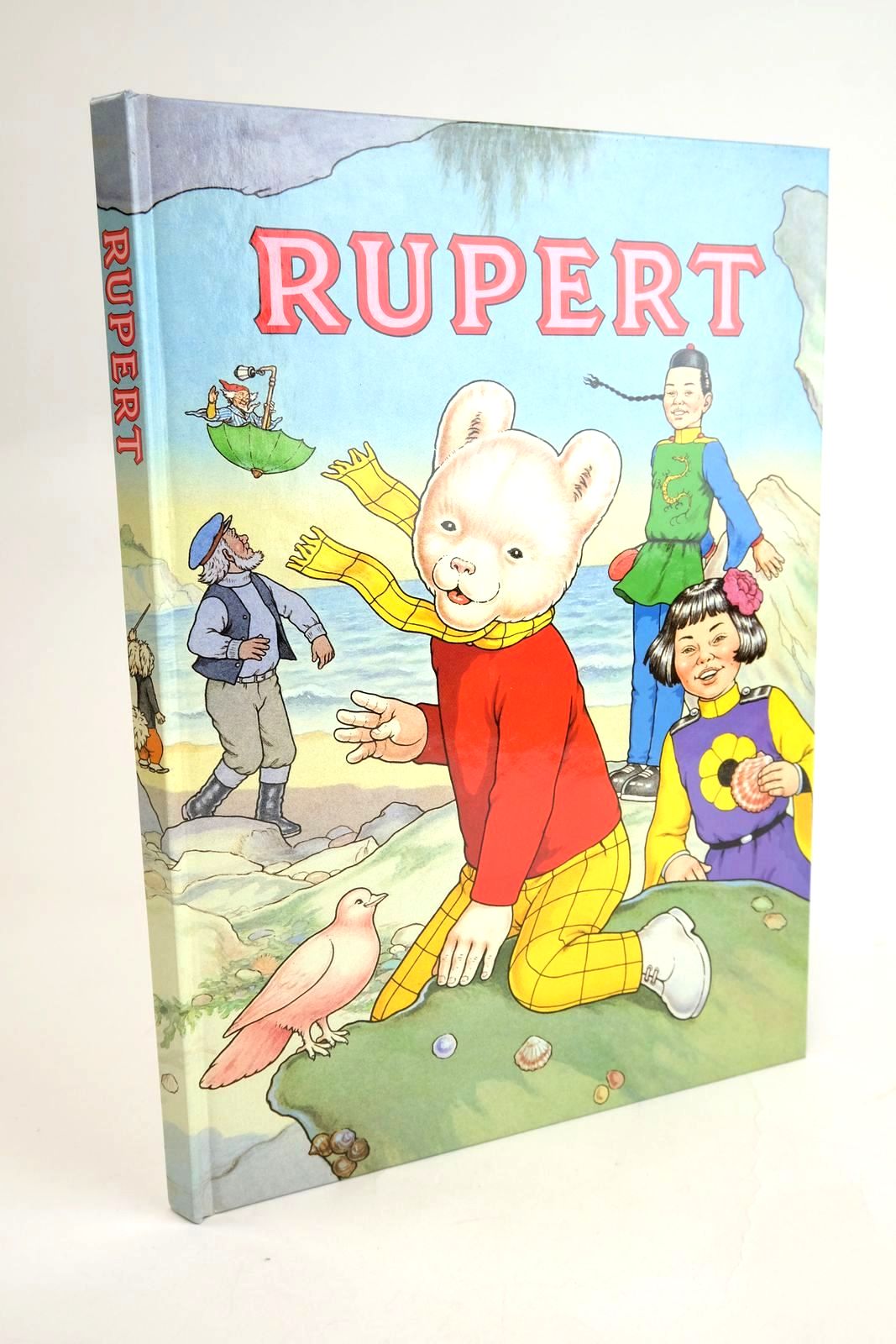 Tall format glazed boards - Rupert on rock at seashore with dove. Pictorial endpapers by Alfred Bestall, cover design by John Harrold. ISBN: 0850792428. Top edge of textblock is lightly foxed.