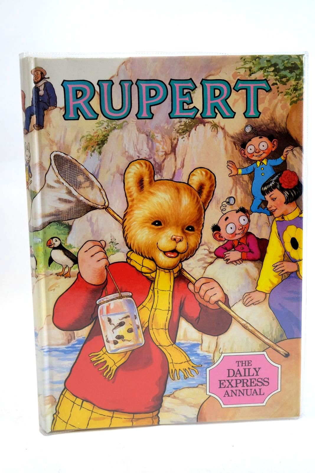 Tall laminate boards - Rupert with net and tadpoles in jar. 1st story Rupert & the Strange Airman. 100 pages. (In 1986 Alfred Bestall, the first illustrator of Rupert annuals, died at the age of 93). ISBN: 0850791596. Name in belongs to box. Minimal bumping to spine and corners.