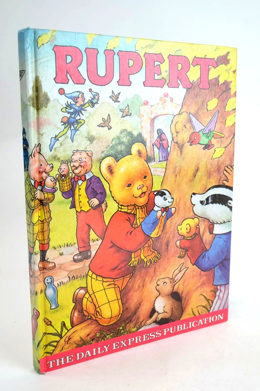 Tall format glazed boards - the first Rupert annual in this format. Cover design of Rupert playing with glove puppets. 1st story Rupert and the Flavours. ISBN: 0850790964. Spine and corners bumped and rubbed. Child's name in pencil crayon to belongs to box. Price NOT cut. Pale page browning else contents clean.