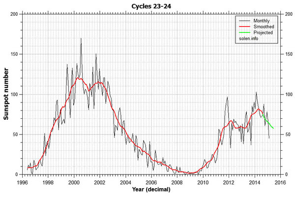 In 2015 the sun is just emerging from 'solar maximum', the period in its roughly 11-year cycle when the number of sunspots is highest. However, this solar maximum is the weakest for about 100 years and follows an unusually deep solar minimum at the end of the last cycle (Solar Cycle 23, 2009-2010). Scientists believe that the sun may be about to enter a 'quiet period' with few, if any, sunspots over the next couple of decades, but alarmist Press reports that speak of another Maunder Minimum and Little Ice Age are overblown – so, yes, dont panic!