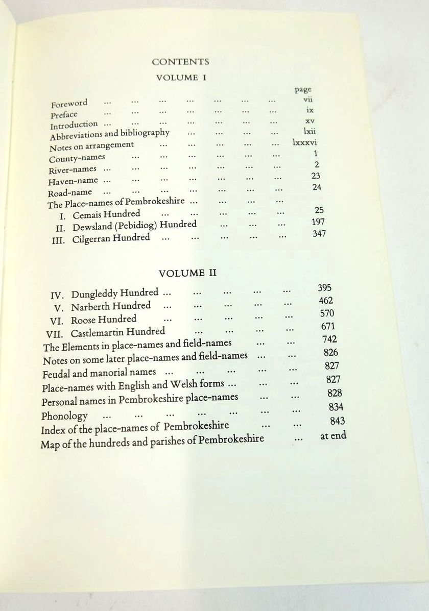 Slightly better than very good condition in a very good dustwrapper. A fascinating study of Pembrokeshire place-names containing the most comprehensive collection of names of the county - the administrative and territorial (commotes and hundreds) to the most local (villages, fields, streams) - ever compiled. Two volumes. Blue cloth boards, gilt title to spines. Folding map to rear of volume II.