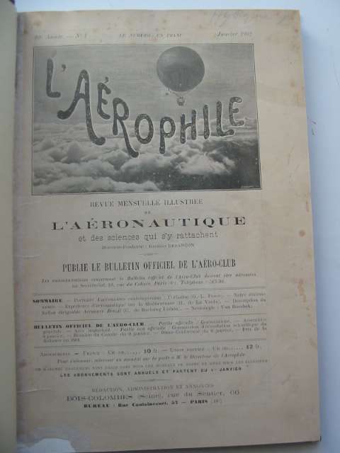 Very good condition. Six copies of 'L'Aerophile' magazine bound in red cloth with gilt title to spine. Includes 10th Year issue 1 Janvier 1902, 10th Year issue 6 Juin 1902, 10th Year issue 10 Octobre 1902, 10th Year Issue 11 Novembre 1902, 12th Year Issue 10 Octobre 1904, and 13th Year Issue 11 Novembre 1905. Text in French.